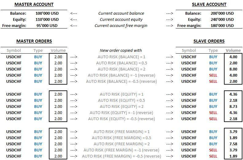 Formula: Slave Order Size = (Slave Account Balance / Master Account Balance) x Master Order Size x Auto Risk Value.