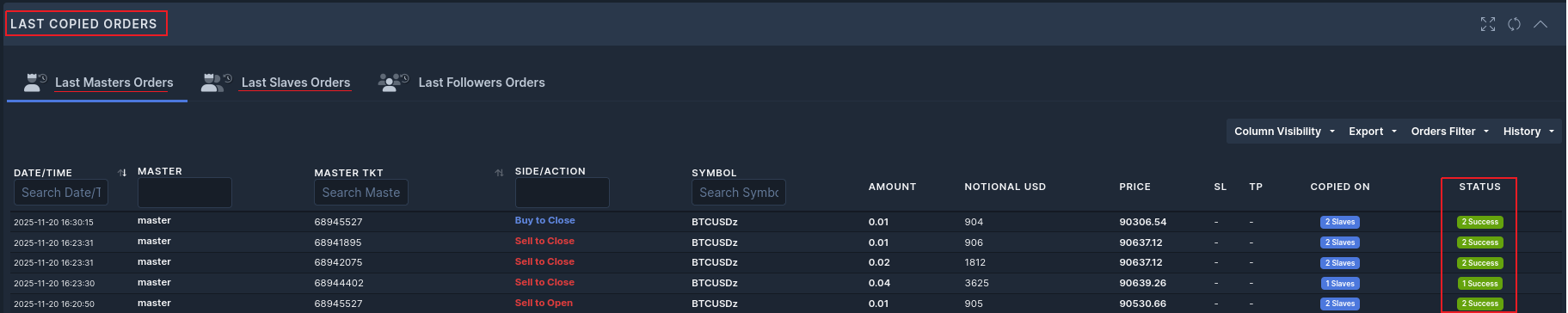 On the Dashboard Cockpit section, you can find Last Copied Orders, please see screenshot for reference: