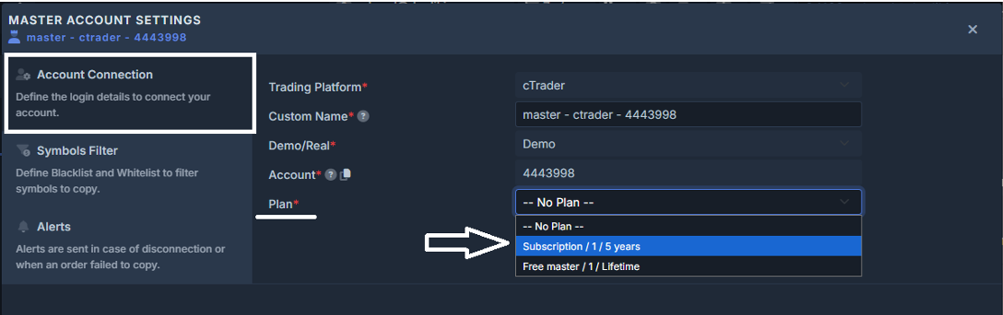 Important to note that a Subscription Plan or Prepay Plan has to be assigned to you trading account in order to have access to all features, settings and unlimited trading.