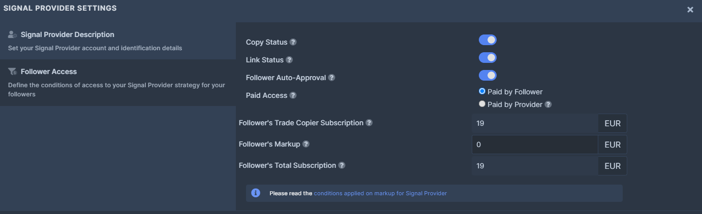 Set up your Follower. Hover your mouse to ?-mark icons to get description of these fields. This page tackles how the subscription will be managed (paid by the signal provider or paid by the follower). You can also add mark up, so can earn extra from each registration you get.