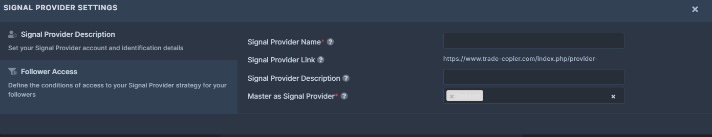 You can define your Signal name, mark-up, and etc. In case you are lost, contact us on the Live Chat or by email at support@duplikium.com to set up your Provider/Follower Trade Copier.