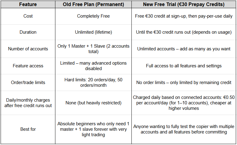 Duplikium has completely replaced the old permanent Free Plan that offers 1 Free Master + 1 Free Slave with a new Free Trial model that comes with €30 of free prepay credit. Here’s a clear side-by-side comparison: